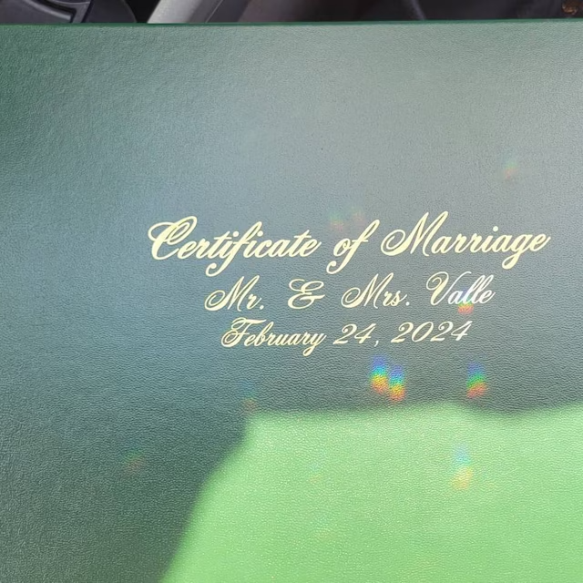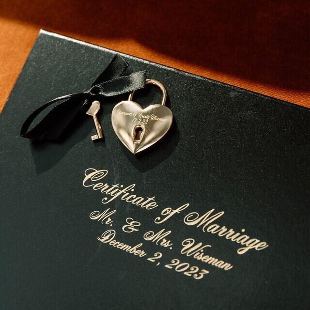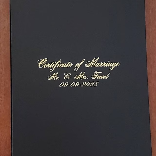 Protect and professionally display your marriage certificate with this durable, hardback leatherette cover in a classic tent-style orientation. Designed specifically for 8.5" x 11" or A4 sized certificates, the phrase "Certificate of Marriage" is printed on the front center, in your choice of font, with the option of metallic gold or silver foil. Personalize this cover by adding a name and/or date below the central phrase, creating a unique and meaningful touch. This cover is perfect for preserving and showcasing your important document, combining both style and functionality.